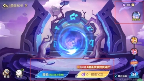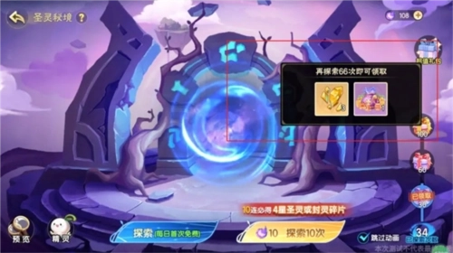左下角的预览功能可查看获取星级圣灵的概率,右侧显示已探索的次数,累计达到一定次数就能领取相应奖励,包括四星自选圣灵、圣灵经验、圣灵碎片等,这些奖励可用于后续圣灵的培养与提升。
