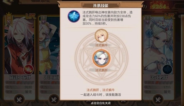 如图所示,当选择小龙虾的连携技后,会出现提示:只有与辣条一同进入战斗时,该连携技能才能被激活。
