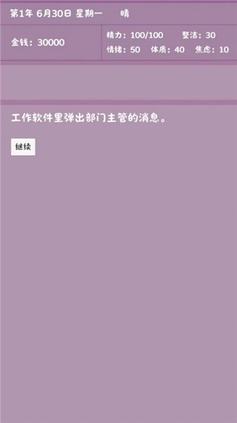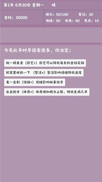1、游戏中有精力值、整洁、体质等多种角色属性设定,每天的行为会消耗精力,隔天恢复。