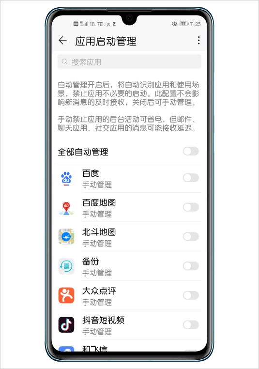 开启全部自动管理后,手机管家会自动识别应用及使用场景,并禁止不合理的应用活动。在此过程中,新消息的及时接收不会受到影响,让你既省心又省力。