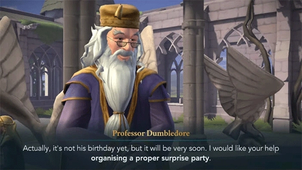 这次演练会以一名二年级学生的视角来介绍游戏玩法。考虑到一年级及更高年级的学生都能参与冒险,所以依据你当前的主线故事推进程度,部分任务的星级和属性条件或许会存在差异。等你抵达那里后,就能和一些学生进行互动了。点击他们头顶的对话气泡,看看他们想跟你说些什么。接下来,邓布利多会告知你海格的生日即将来临,他希望你帮忙筹备一场惊喜派对。