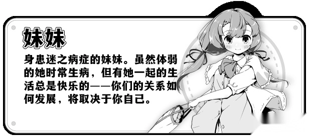 身患一种原因不明的怪病的妹妹。尽管她身体孱弱,常常生病,但有她陪伴的日子总是充满欢声笑语——你们之间的关系会走向何方,完全取决于你自己的选择。