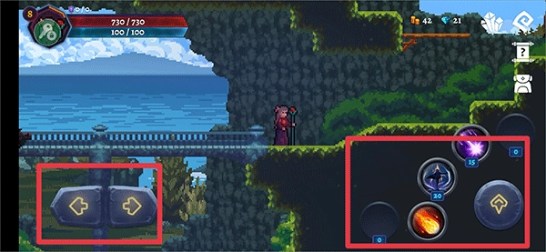 进入游戏后,通过左下角的左右按钮来控制角色移动,右侧的向上按钮用于跳跃,其余按钮则对应角色的各项技能。