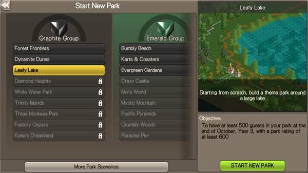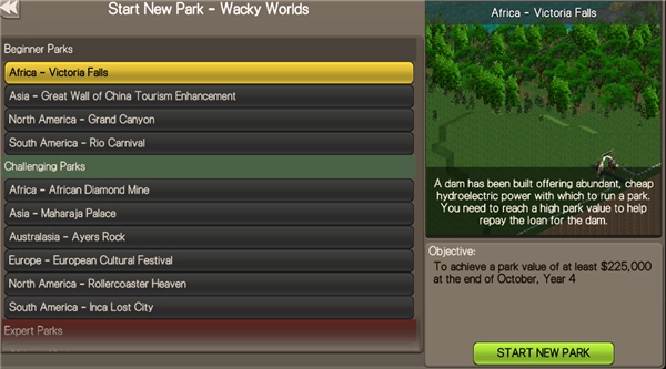 若想自行建造公园,可点击首页的“Start New Park”选项,然后挑选一个公园场景。