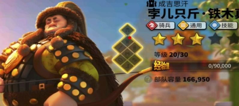 2、铁木真的输出伤害相对普通,不过他的技能能够增强部队的士气、攻击力与移动速度。