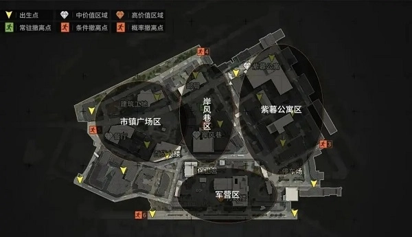和农场、山谷以及北山这些地图一样,军港也设有普通模式与封锁区模式。接下来我们主要围绕普通模式展开解析,封锁区的相关内容会在之后再和大家详细探讨。首先,我先带大家对军港的地形做个初步的熟悉。军港属于典型的巷战类地图,房屋与街道相互交织,我们可以依据建筑群把军港大致划分成四个区域:位于西北方向的市镇广场区、处于中间位置的岸风巷区、东部偏北的紫暮公寓区,以及南部单独成片的军营区。