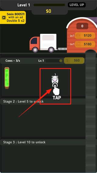 1、处于游戏第1级界面时,金币数量为0。此时点击升级按钮,可通过观看广告获取5分钟的双倍金币权益;另外,也能选择点击TAP区域进行操作,或是对建筑执行升级动作。
