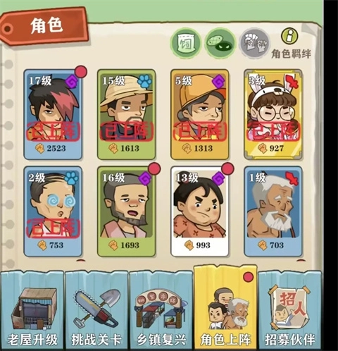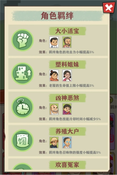 除了升级可以带来增幅外,上阵阵容的搭配也是一门大学问,不仅要综合考虑不同角色的定位,同时注意角色之间存在的羁绊加成。目前,现有的角色定位分为三类,分别是辅助类、攻击类和辅助类。这三大类的角色还是很好区分的,大家可以在角色面板中直观看到。同时,在搭配时,不要忘记点开角色羁绊,里面记录着各个角色之间的羁绊组合以及加成效果,比如郑妈妈和送水工邓哥就有一个养家糊口的效果,会较少我们15%的技能冷却时间。除此之外,还有增加攻击力的、增加攻速的、增加恢复的等等的羁绊。羁绊也是有强有弱,一些品质低的人物所带来的羁绊效果就比较弱一些,但是也是会增加我们的战斗力的。