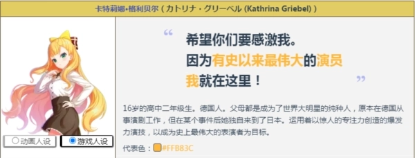 16岁的高中二年级学生,来自德国。她的父母都是声名远扬的纯种人,原本在德国从事戏剧相关工作,不过在经历了某件事后,她独自一人来到了日本。