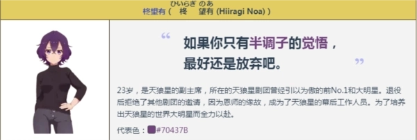 16岁的高中二年级学生。自儿时起便对天狼星的戏剧心怀憧憬,为了实现成为世界巨星的梦想,参加了剧团的入团选拔。