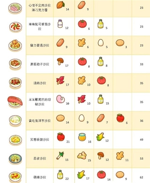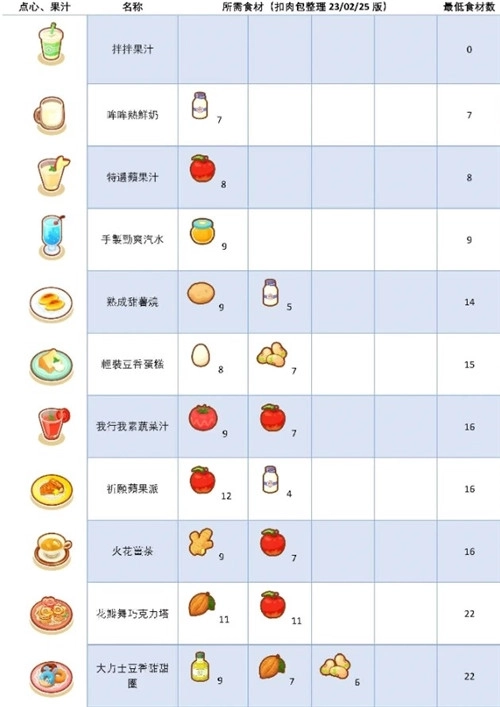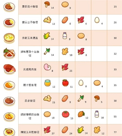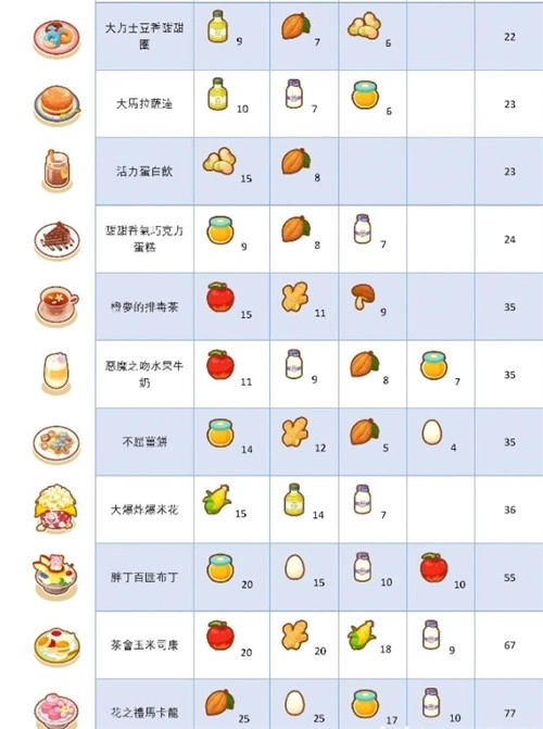 游戏里会从食材基础能量、料理菜谱这几个板块展开说明,介绍咖啡、饮料、甜点这类食物所需的食材和制作方法,内容将以图表形式呈现,玩家只需查看图表就能了解。