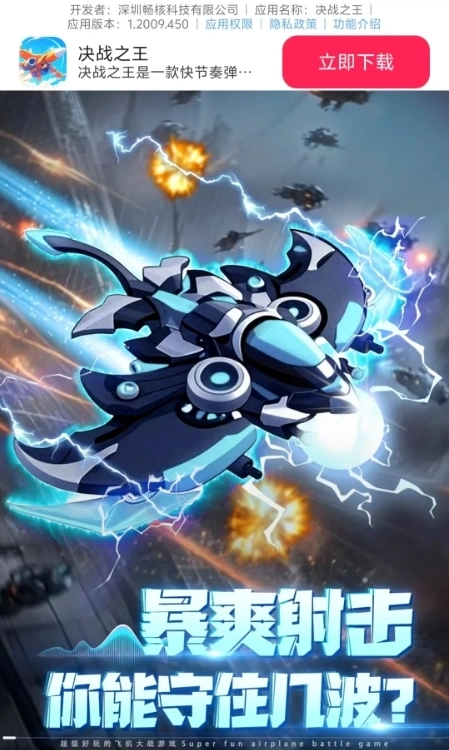 由深圳畅核科技有限公司精心打造的超人气飞机肉鸽射击手游《决战之王飞机游戏》,凭借爽快的快射弹幕对战玩法带来源源不断的激情,让人欲罢不能。游戏内多样战机等待你逐步解锁,开启肉鸽射击对战的乐趣,绝对值得一试!快叫上小伙伴们一同安装体验吧!
