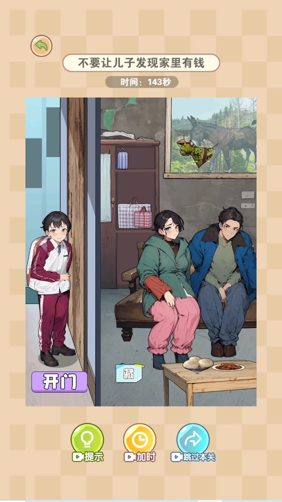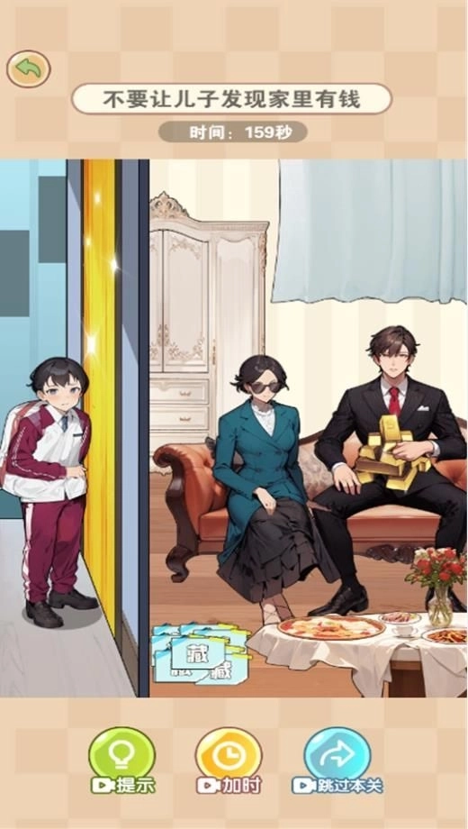 1.在规定时间内成功完成关卡,务必不能让儿子察觉到家里藏有金钱。
