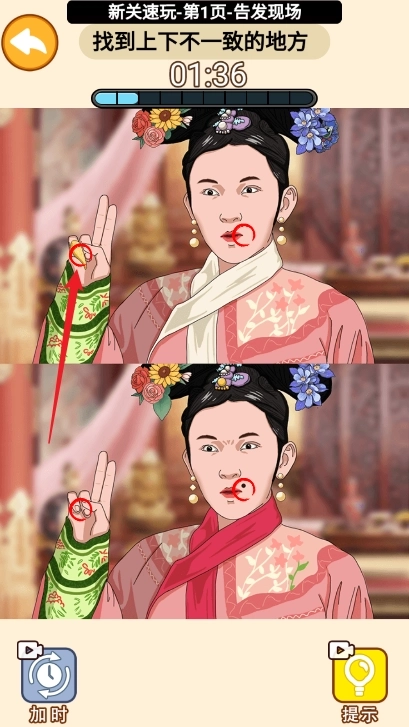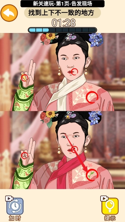 在经典的找不同玩法基础上增添了丰富的设定,使你能体验别具一格的找不同模式,畅享自由闯关的乐趣。每一关都设有全新的挑战,你需要仔细留意场景里的每一处细节,找出所有存在差异的地方。要是遇到难题,还可以借助道具来获得提示,从而在限定时间内顺利找出所有不同点。