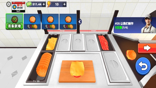 系统会提示你依据订单信息挑选合适的食材,依照步骤组装汉堡,并且在指定时间内完成出餐。