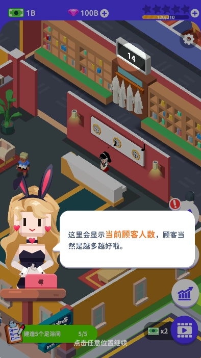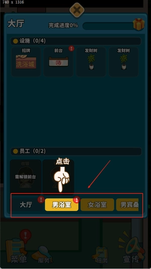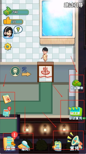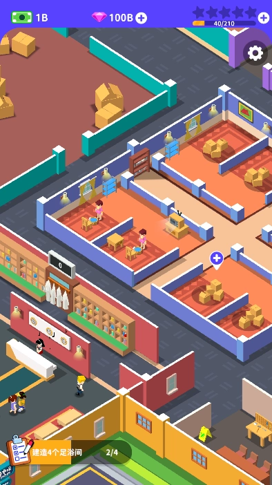 1、开始游戏后可以自由选择建设区域,点击对应位置放置设施或装修,根据需求调整布局打造理想中的洗浴中心。