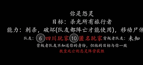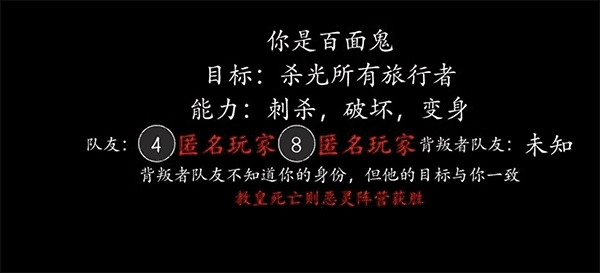 查验的结果只会显示“旅行者”或者“恶灵”这两种情况,只有在面对教皇的时候,才会暴露其真实身份。这个技能的冷却时间比较长,所以使用的时机需要特别谨慎——如果用得太早,很容易被针对;要是用得太晚,又会错过重要的机会。发言的时候应该多进行逻辑分析,不要直接说某人是“查杀”,更不能没有根据就随便站队,不然可能会被反过来指责是假神或者内鬼。