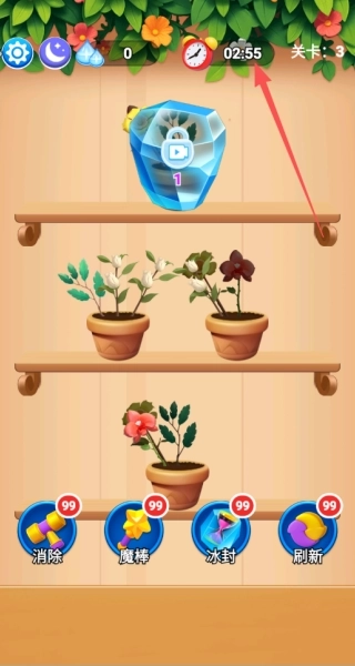 2、请留意顶部的进度条和倒计时,只有在规定时间内把所有花朵都清除掉,才能拿到完美评价。