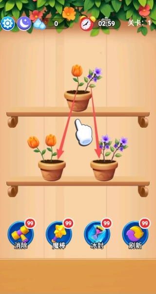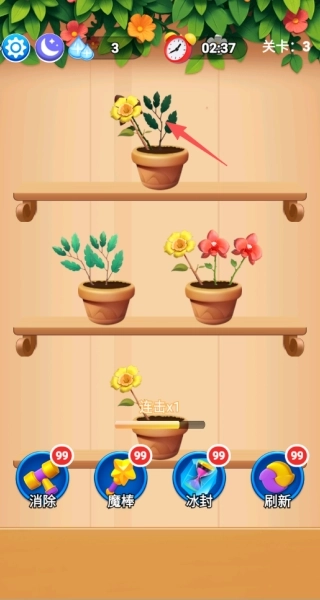 2、消除的方式并非只有一种,同一关卡既可以先清理边缘的花盆,也能够先解锁隐藏的花朵。