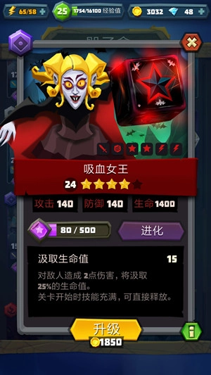 【四星】对目标造成2点伤害(用来清理小怪效果非常好),同时恢复自身四分之一的生命值(攻击带有护甲的目标时无法触发回血效果),技能冷却时间为15秒,战斗开始就能立即释放。