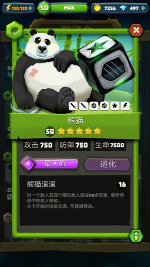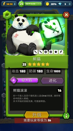 【五星LV.25】开局即可释放技能,国宝熊猫拥有宽泛的攻击范围,能对目标造成随机五次1~2点的伤害,同时附带眩晕效果,首个攻击目标可自主选择,技能冷却时间为16,推荐将其放置在中间位置。
