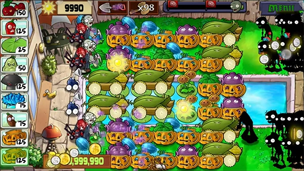 6、火力全开:先在第一排种上一个玉米加农炮,之后剩下的位置全种四发豌豆射手,不管僵尸有多厉害,都没法突破这种火力拉满的阵型。