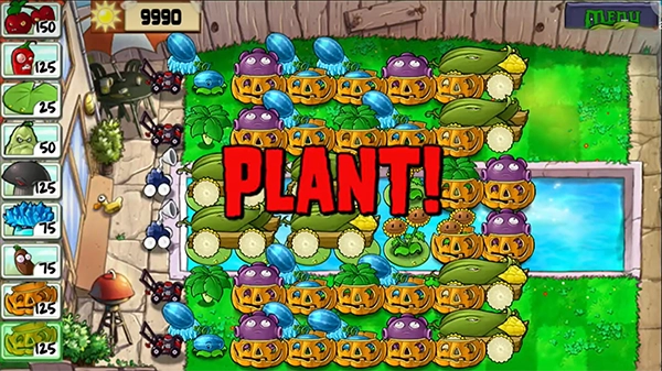 3、火弹炮:首先在最后一排种上高坚果,接着给它套个南瓜头,后面全部种四发豌豆射手,这样攻击伤害相当恐怖,僵尸别说啃南瓜头了,还没碰到就被消灭了,就连比较肉的僵尸也活不下来!