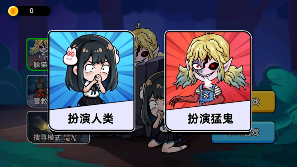 恐怖冒险躲猫猫版是一款哥特风格的躲藏对抗游戏,玩家能在其中体验紧张刺激的潜行对决。你可以选择成为隐藏者或追捕者,在被浓雾笼罩的古老城堡与阴森墓地中展开较量,借助场景布局、角色技能与战术布置来实现生存或猎杀的目标。