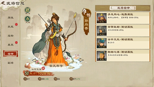 解锁对应的宿命武将后,就能激活宿命效果,大幅增强战力。有一些合击技需要两位武将同时上阵才能使用。