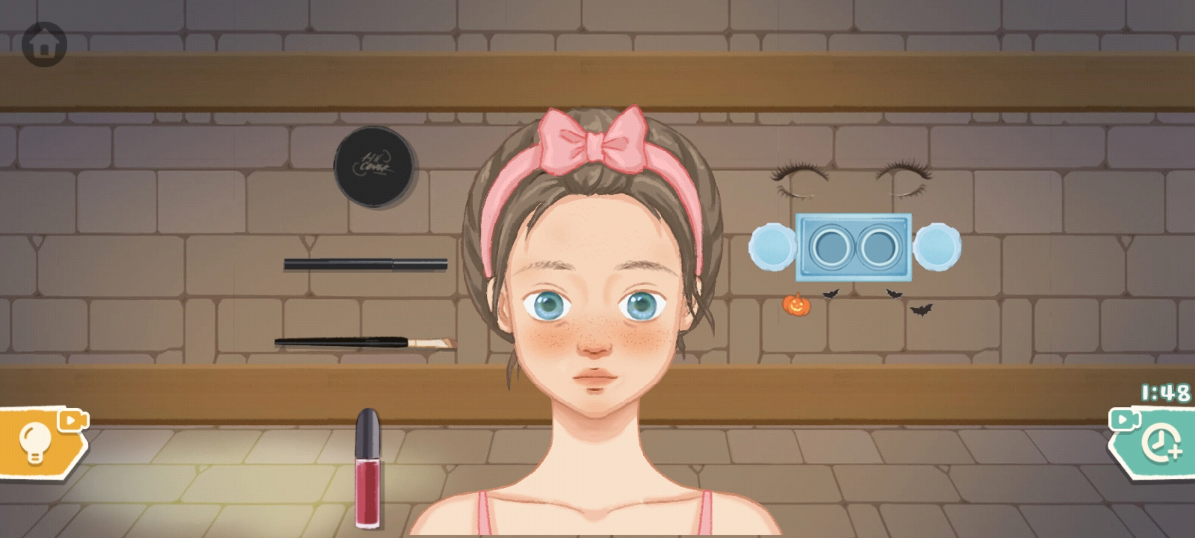 3、【一起捣蛋】关卡要求扮演万圣小魔女,第一步是打开美瞳盒,然后把美瞳逐个戴上。