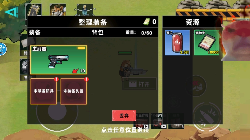 2、地图里会刷新出不少资源,我们点击【打开】按钮,就能把这些资源收集到背包里了。