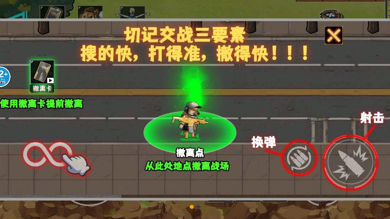 1、进入游戏后,首先会看到操作指引:玩家需滑动左下角的摇杆来控制角色进行上下左右移动,右侧的按键分别对应换弹和射击功能。