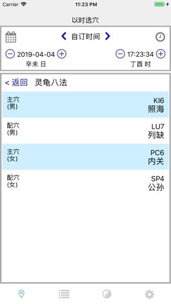 2、本软件具备灵龟八法、飞腾八法、子午流注纳子法与子午流注纳甲法的即时开穴及择时开穴功能。