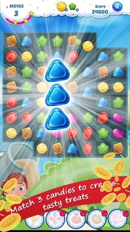 一款相当不错的消除闯关游戏,这里的挑战内容很有意思,超多不同的关卡设置,各个难度层次分明,你可以通过自己的操作,尽情感受其中的乐趣。这游戏很容易让人上瘾,既好玩又有难度,一旦开始玩就很难放下。点击一个果冻并拖动到空位来移动它的位置,将四个或更多相同颜色的果冻在水平、垂直或对角线上连成一线,就能消除它们并获得积分。