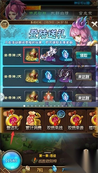 在「活动」界面中找到登录送礼处领取登录奖励就行,登录奖励除了补天丹,还有其他诸多丰富奖励。