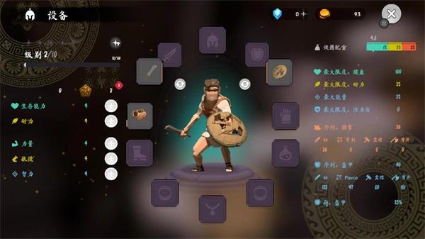 点击右上角的头盔图标即可打开角色界面,在该界面中,你能够为角色装备武器与防具,还能进行角色属性加点操作。