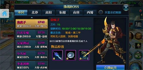 装备的主要获取途径依旧是挑战国家boss,战斗中会掉落蓝、绿、橙品质的装备。要是爆出橙色装备,现阶段的装备需求基本就不用发愁了;如果橙色装备数量较多,还能合成更高级的红色装备。角色等级达到40级后,就能解锁boss页面,记得每天在固定时间去参与挑战。只要运气不算太差,凑齐一套橙色装备会很快。