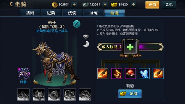 技能方面,帮派养猪副本和55级开启的武帝城登楼玩法都会产出;也能用50金子进行领悟。一共能学5个技能,不过学习新技能时,有可能随机顶掉已有的某个技能,也可能额外增加一个技能槽位,这就得看运气了。建议优先选择直接提升人物属性的技能。洗髓的话,主要看坐骑的主属性是什么,就重点洗对应的属性。当属性转化率较高时,高V玩家可以买洗髓锁来固定属性,每个50金子;低V玩家就不建议使用了。