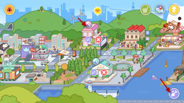 1、点击右下角的铲子按钮,房子上便会出现粉刷图标,点击该图标即可进入。