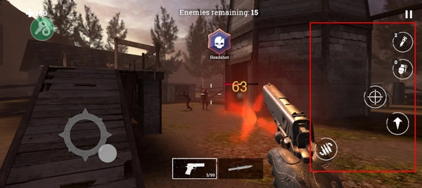 5、借助右侧的按键可查看血量、手雷情况,还能进行瞄准、跳跃以及操作换弹按钮等。