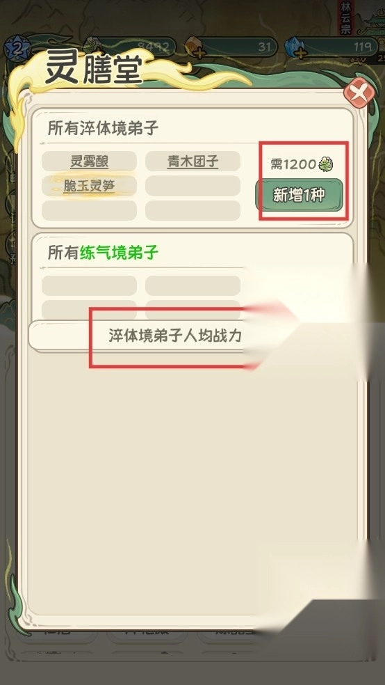 3、在灵膳堂消耗资源新增菜品,可提升淬体境弟子人均战力,增强宗门实力。