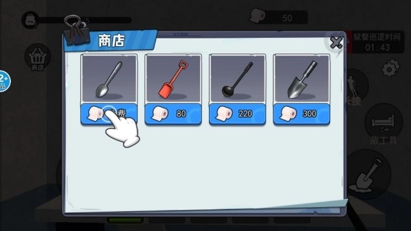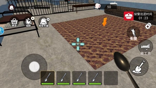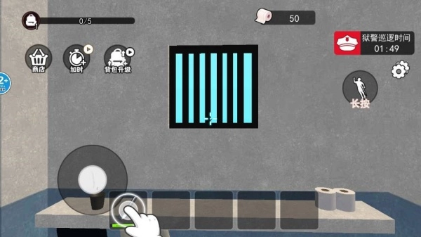 2、要时刻留意界面上狱警巡逻的时间提示,在剩余时间还比较充裕的时候抓紧快速挖掘,等快到巡逻时间时就得及时停下动作,并且把工具藏好,避免被搜查出来。
