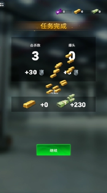 3、任务完成后,你还能获得丰厚的金钱奖励,点击“继续”即可开启枪战环节。