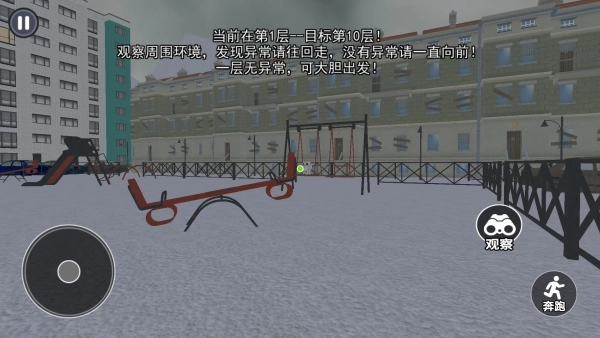 1、在有游乐设施的场景里,利用“观察”功能检查秋千、跷跷板这类设施有没有异常情况,确定没有异常后,顺着开阔的路径往前走。