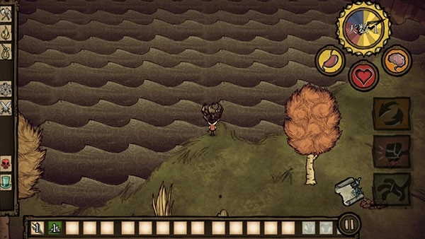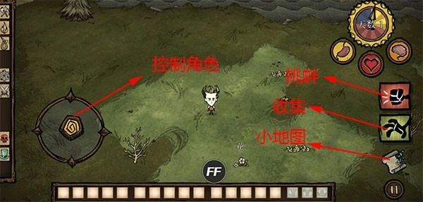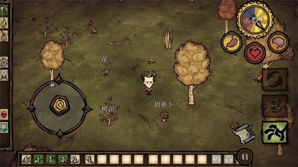 6、游戏正式开始后,左侧区域用于控制角色方向,右侧则负责资源收集。玩家需要尽可能收集所有可利用的资源,以此来躲避饥荒的威胁。