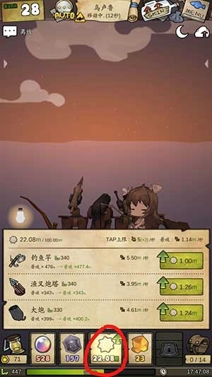 点击底部第三个“鱼饼”图标,就能同时升级鱼叉炮台和主鱼竿。需要注意的是:炮台会全程自动攻击,但鱼竿还是得手动点击才能释放伤害——所以前期一定要优先提升鱼竿的攻击力,到了中期再兼顾两者平衡发展。它在对抗Boss级生物(比如人鱼守卫)时,有着无法替代的爆发力。