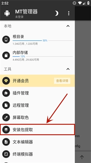 3、打开Mt管理器,点击界面左上方的三条横线图标,接着选择安装包提取功能。
