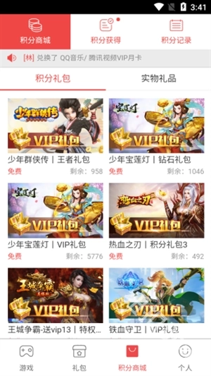 4、在积分商城页面,你可以了解积分礼包的相关信息,也能知晓实物礼品的领取情况。