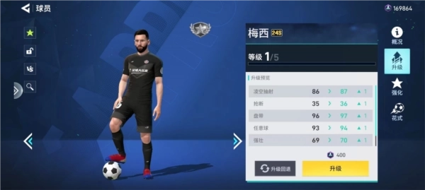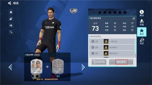 添加球员材料能够对球员进行强化,强化后球员的总评数值会增加1,在强化属性预览界面可以查看具体的强化效果。