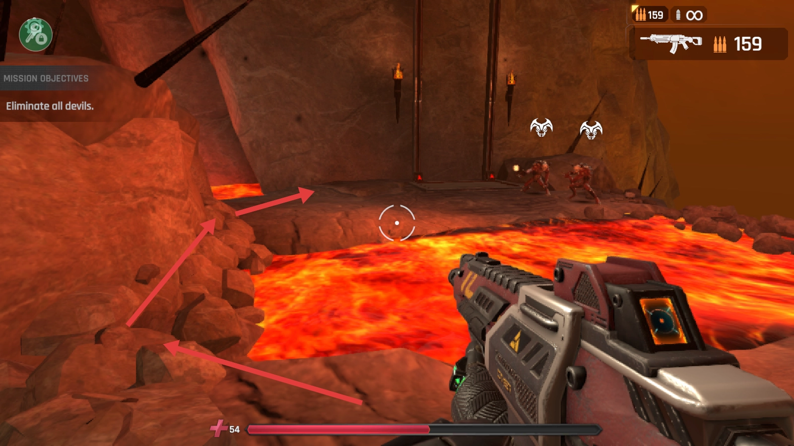 在熔岩遍布的地形中,要留意自己的移动路线,避开那些危险区域,先把远处的恶魔解决掉,这样才能顺利推进游戏进度。